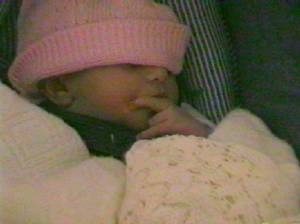 I'm in my car seat and ready to head home! (The hat is now pink--not so bad, but I still can't find my hands!) |